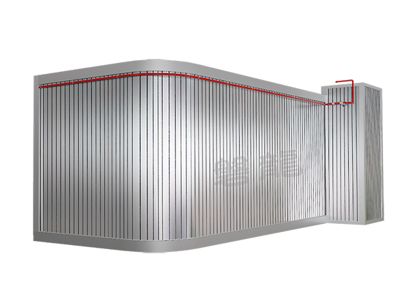 侧移式(侧向卷)卷帘的帘面从侧向启闭,平时帘面收纳在侧面的包厢内,火灾时自动关闭,同时喷洒水雾,进行冷却保护。